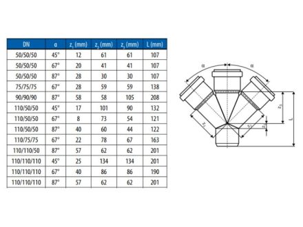 HTDA Dvojitá odbočka 45°, jmenovitá světlost DN 110/50/50