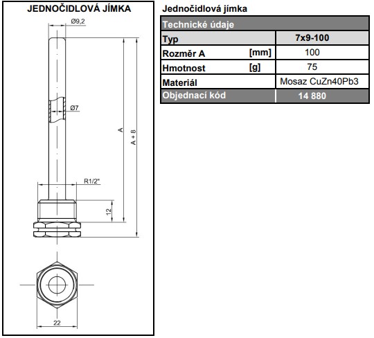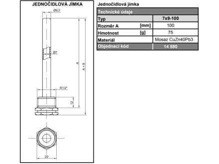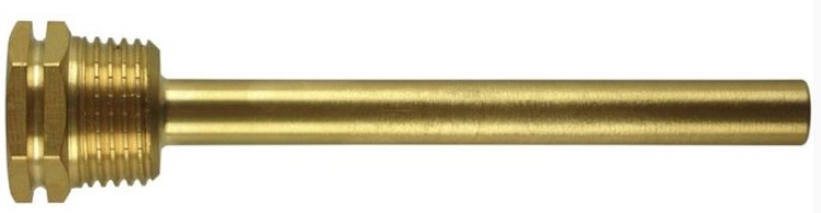 Mosazná jednočidlová jímka REGULUS 7 x 9 x 100 mm se závitem 1/2" pro snadné umístění teploměrů a snímačů teploty do měřících míst, slouží k ochraně čidel teploměrů a snímačů teploty a v případě potřeby umožňuje jejich snadnou výměnu.