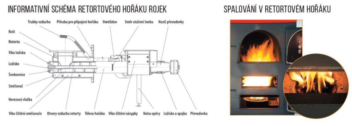 Automatický teplovodní kotel ROJEK TKA 25 umožňuje automaticky spalovat hnědé uhlí OŘECH 2 o zrnitosti 4 – 25 mm nebo dřevěné pelety o průměru 6 – 10 mm, kvalitní bílé, ale i s příměsí kůry. V kotli je instalován retortový hořák, který je konstruován na principu spodní dodávky paliva do spalovací části a samotné spalování připomíná hoření v kovářské výhni. Z násypky je palivo dodáváno šnekovým podavačem do litinového kolena retorty. Zde je vytlačováno vzhůru na kruhový rošt. Retorta je umístěna ve směšovači, do kterého je foukán vzduch ventilátorem. Vyhořelé palivo - popel a struska - přepadávají přes okraje roštu do popelníku. Kotel si po dobu topné sezóny udržuje stálý plamen.
